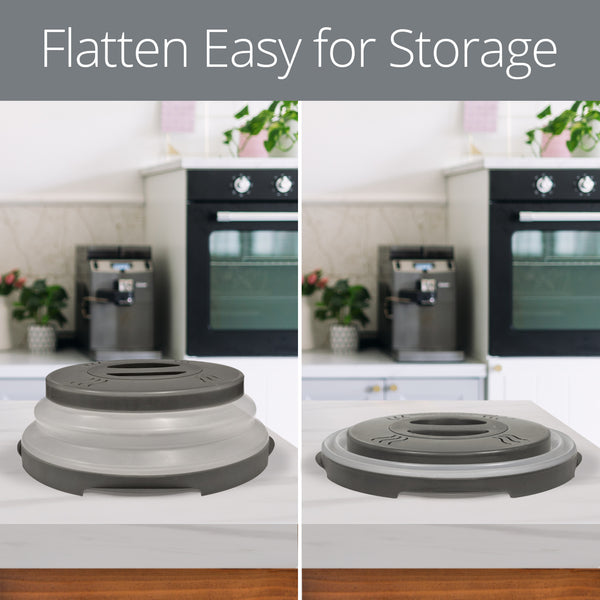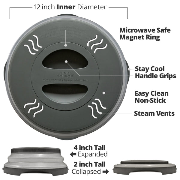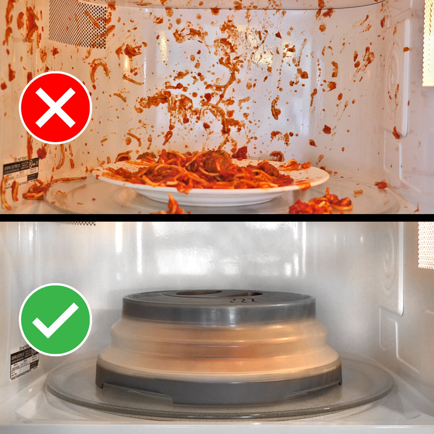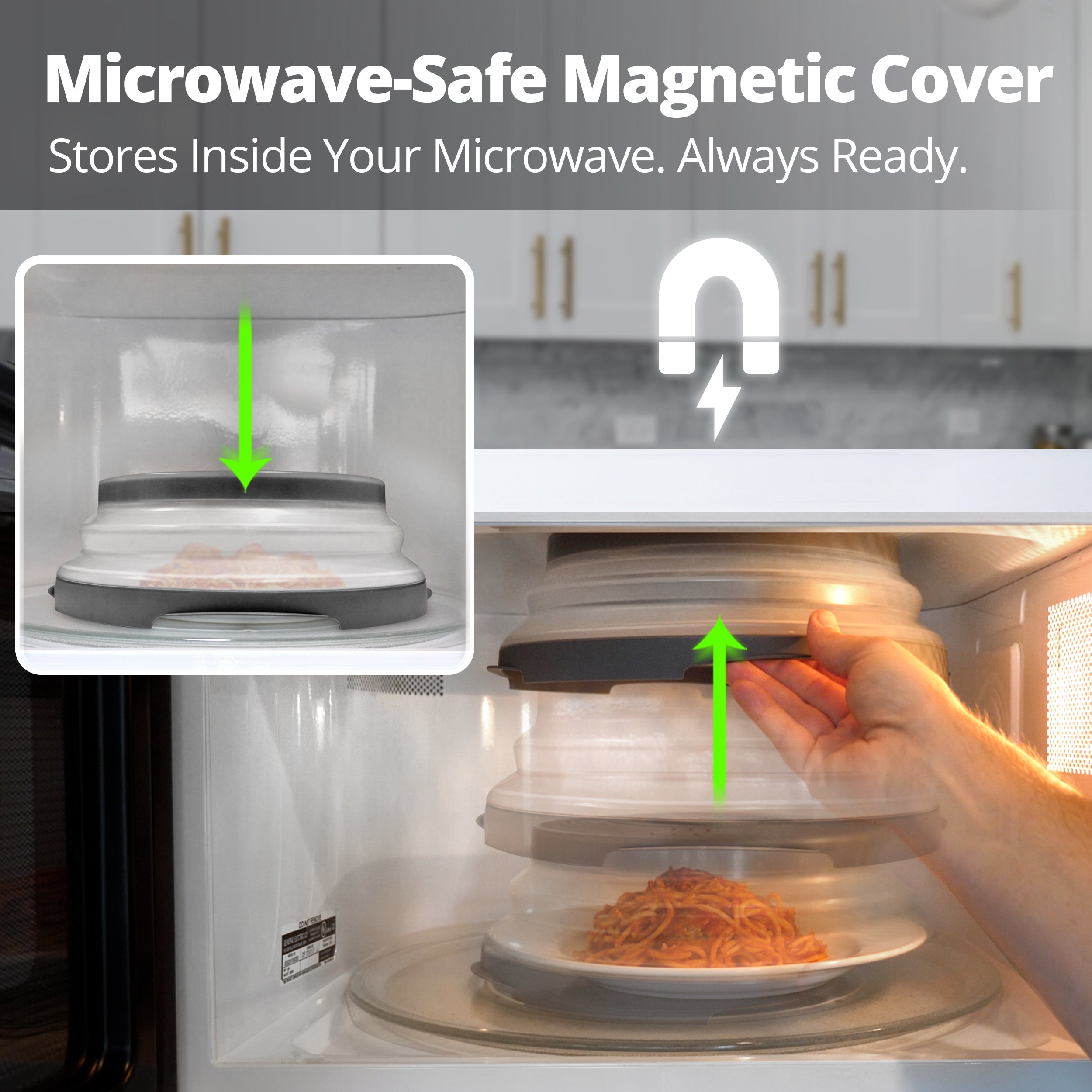 Splatter guard food cover with microwave safe magnets cling to the ceiling for easy storage. Always ready. Never in the way.