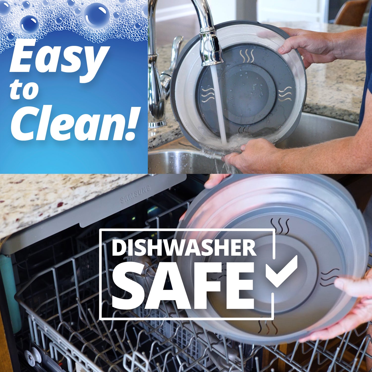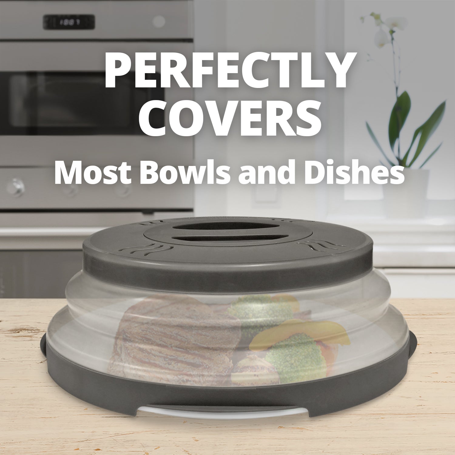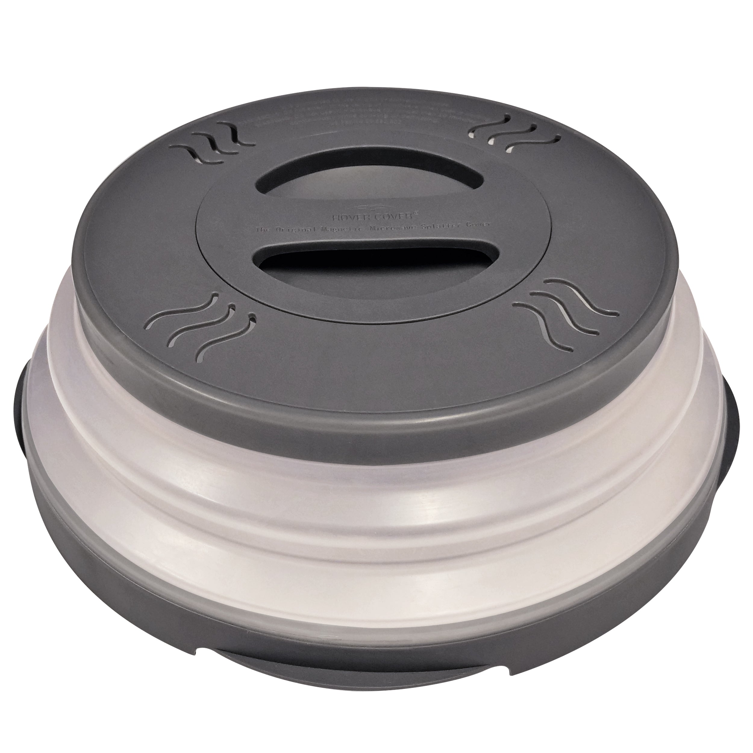 Splatter guard food cover with microwave safe magnets cling to the ceiling for easy storage. Always ready. Never in the way.
